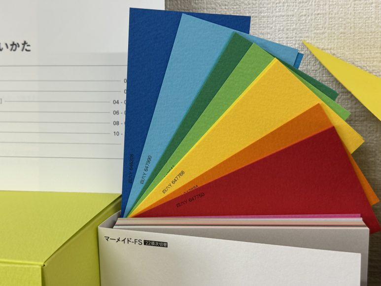 色の選定にあたっては、照明環境や紙ロットによる微妙な色差を考慮することが重要です。マーメイドは自然なトーンの色が多いため、昼光色・電球色など異なる光源下で見比べると印象が変化します。デザイン段階で実物チップを確認し、使用環境に近い条件で色味を決めることをおすすめします。