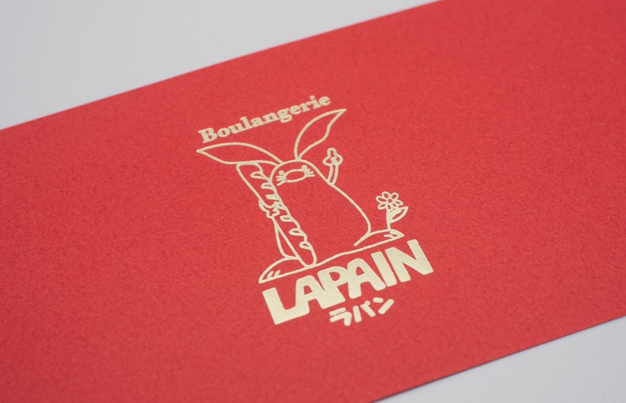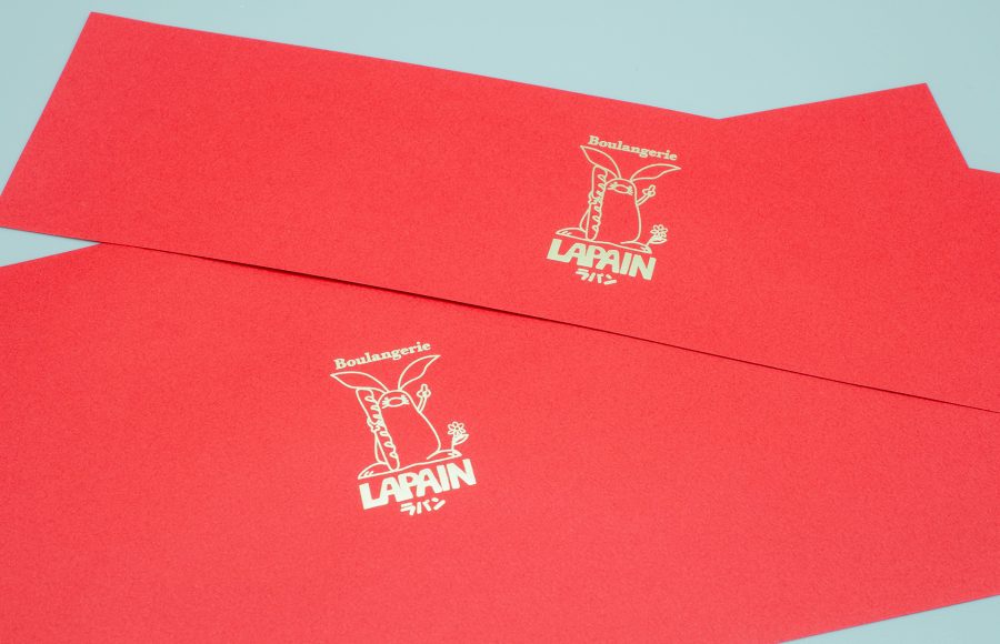 用紙は TANT N-52 70kgの赤い紙にシルキーシャンパンの箔でお店のロゴを箔押ししたラッピング包材です